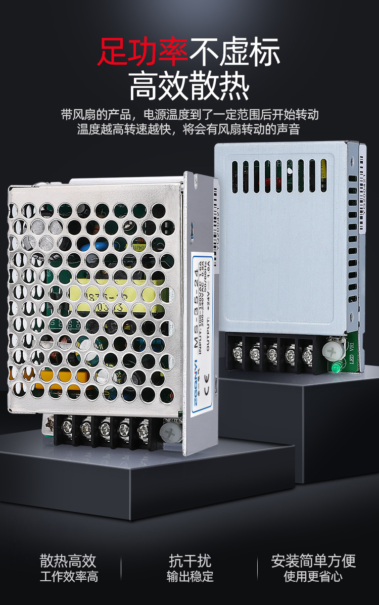 LRS室内电源系列:交流输入范围大,通过开关切换,可承受300vac浪涌输入5秒,保护种类:短路,过负载,过电压,过温度,内有直流风扇强制,